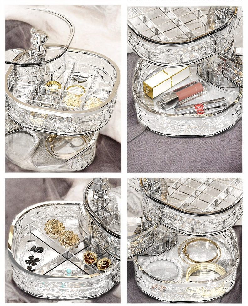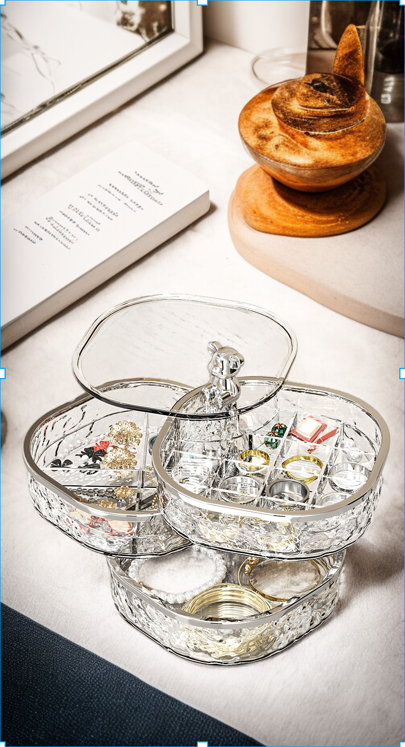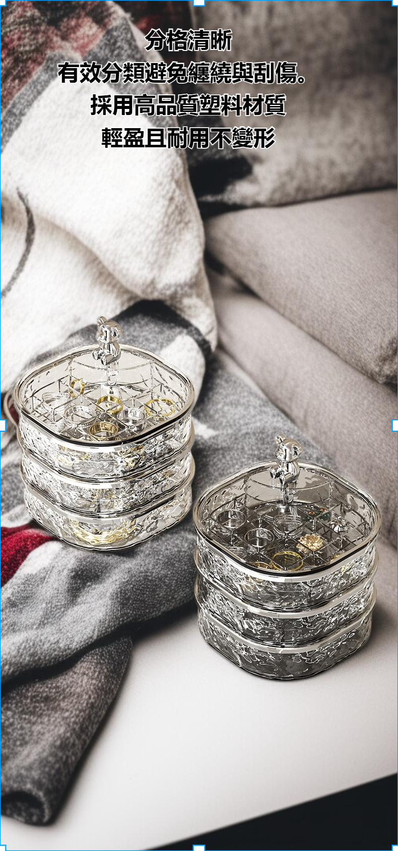 多層收納設計,分類整理飾品,透明蓋防塵防潮,輕奢質感提升居家品味,適合項鍊、耳環、戒指收納,耐用材質易清潔。